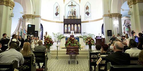 El féretro llegó al templo cerca de las 9:30 a.m., cuando la multitud comenzaba a llenar los bancos para ser partícipes de la misa, y fue colocado frente al altar, rodeado por arreglos compuestos por rosas rojas, y orquídeas, lirios casablanca y hortensias blancas.