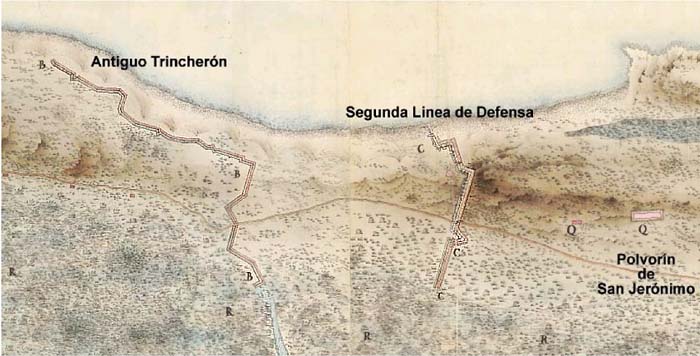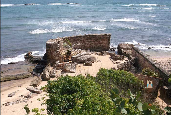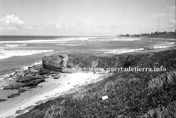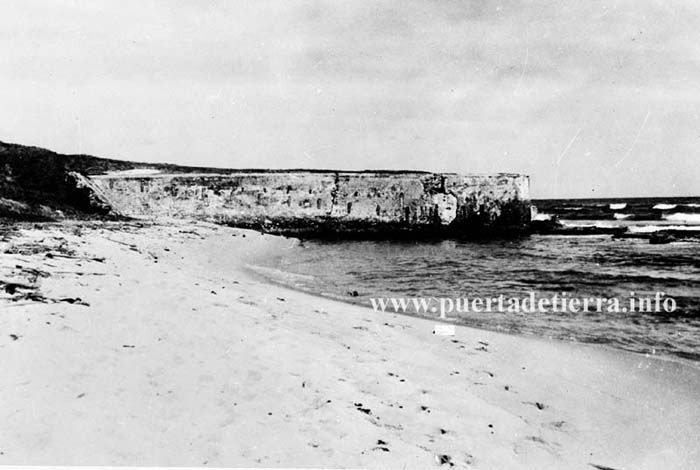 | Desde el fuerte del abanico, del Castillo San Cristóbal se extendía por unas 500 yardas una muralla bordeando la playa y terminaban en un tajamar, que son las ruinas que aún perduran. |