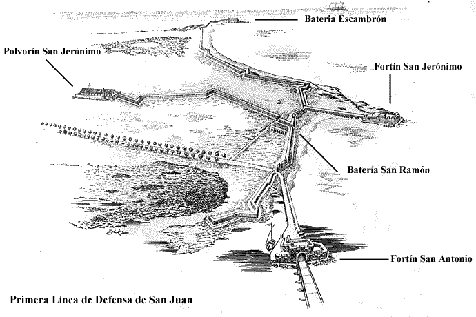 cinco cañones Plasencia de bronce, de 12 centímetros, de retrocarga; que se salvaron del navío Antonio López, atacado el 28 de junio por el buque USS Yosemite cuando se acercaba al puerto de San Juan. A pesar de que se varó a 15 pies de profundidad en Playa Socorro,