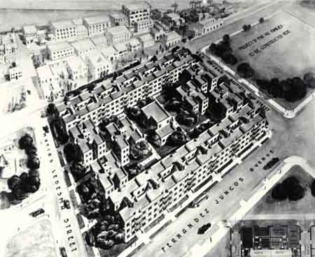 Vista del proyecto "tenement group proyect A" , 1936, preparado por la División de Arquitectura de la PRRA. El proyecto sirvió de base para la construcción del Falansterio, sirvió para alojar 216 familias. Diseño de J. Ramírez de Arellano