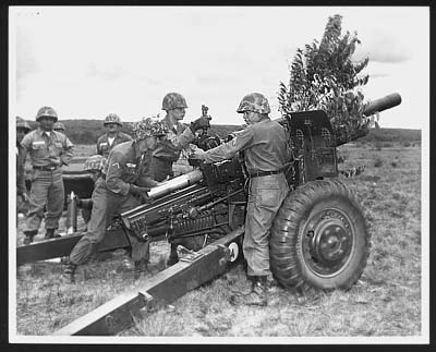 Artilleros de la Guardia Nacional de Puerto Rico listos para disparar su cañón en campamento Camp Grayling, Michigan. El Mundo, 1965. |