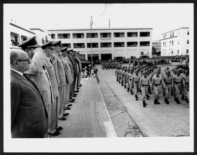 Samuel R. Quiñones y oficiales pasando revista a tropas de la Guardia Nacional, marchando en los cuarteles de Puerta de Tierra. El Mundo,1966. |