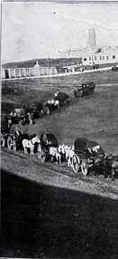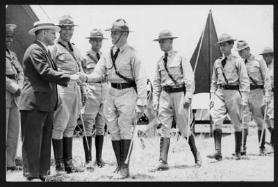 Soldados visten uniforme antiguo con sombrero de campaña y el civil usa sombrero praprá. El Mundo 19__ |