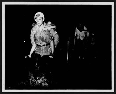 Un miembro de la policia militar de la Guardia Nacional de Puerto Rico rescata a una niñita durante inundación en el pueblo de Cataño. El Mundo, 196_ |