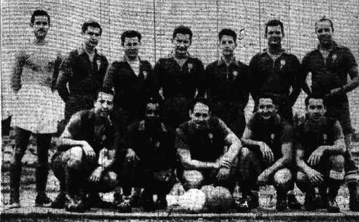 | El equipo Caribe, ganador del campeonato de fútbol insular, aparece aquí. Son sus miembros, de izquierda a derecha, de pie: Pocholo (José) Labrador, Félix Seijo, Alberto Dones, Rafael Pineiro, Manuel Piñeiro, Daniel Bloncourt, y Ostburg
