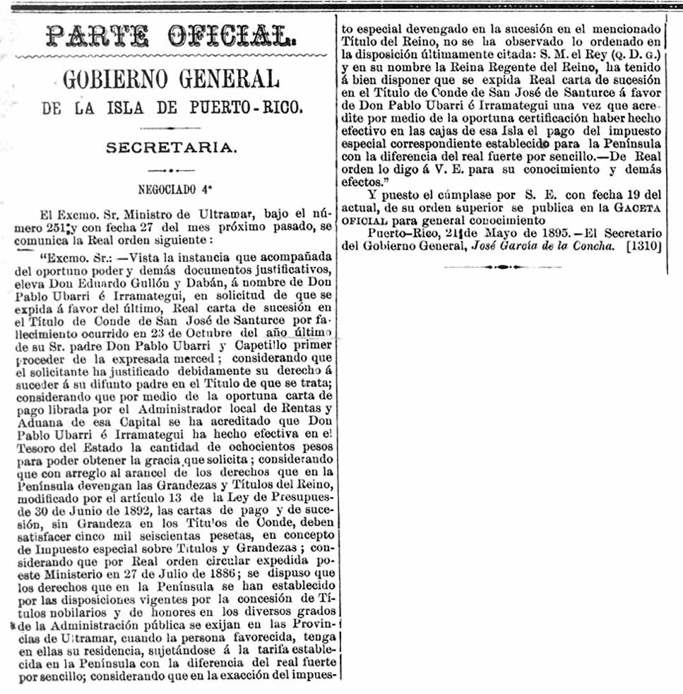 Sábado 1ro. de junio 1895 Carta de sucesión de el Título de Conde de San José de Santurce a Don Pablo Ubarri e Irramategui.