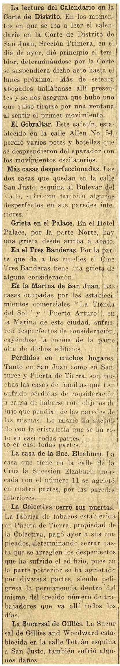 Daños causados por el terremoto del 11 de octubre de 1918 en San Juan y Puerta de Tierra. Recorte tomado de la noticia de primera plana, del periódico La Correspondecia de Puerto Rico, del 12 de octubre de 1918.