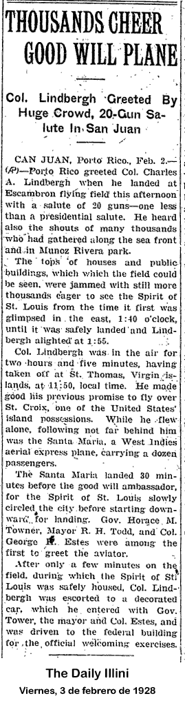 Coronel Lindbergh -Recibido Por Enorme Multitud, -Saludo de 20 cañonazos en San Juan