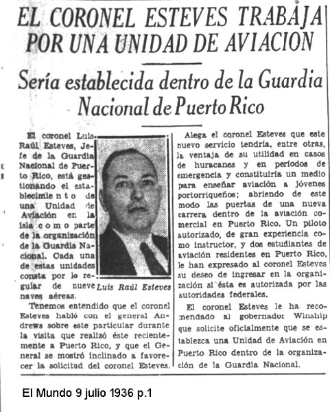 El Mundo Viernes, 3 de enero de 1936 p.9 El Coronel Esteves Trabaja Por Una Unidad De Aviación dentro de la Guardia Nacional de Puerto Rico.