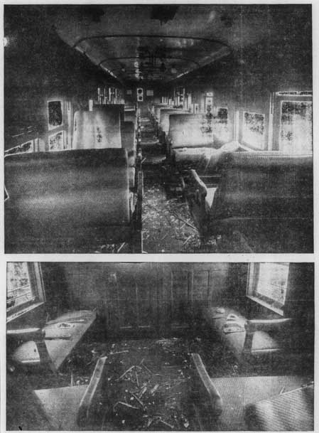 Estas fotografías muestran dos aspectos del interior del coche del ferrocarril A-27, destrozado por un grupo de estudiantes de la Escuela Superior de San Juan que se dirigía a Mayagüez el día 12 del presente mes de marzo, en el tren número 3, con motivo de las competencias atléticas que habrían de celebrarse en aquella ciudad.
