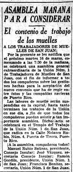 El Mundo lunes 15 de marzo de 1937 p. 7 Asamblea para considerar convenio de trabajo de las Unión num. 1 de Trabajadores de Muelles