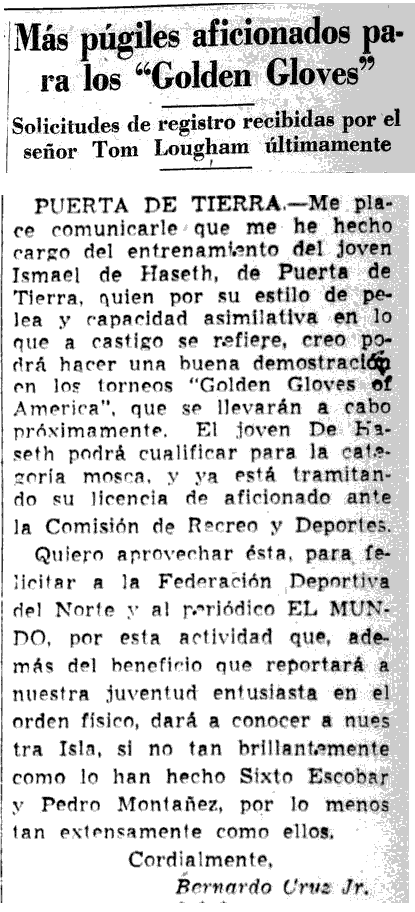 El Mundo lunes, 29 de agosto de 1938 P.10 Ismael de Haseth inscrito en los "Guantes Dorados"