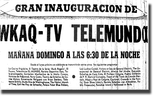 Las Luchas Camel, Victory at Sea de General Electric, The Unexpected de General Electric, Mimicas del Monte, Buscando Estrellas de Coca Cola, El Profesor Colgate, Poema Sinfónico de Puerto Rico, Optical Company, Toast of the Town de Licoln - Mercury, Mapy y Papi de Colgate, Captured, Crusade in the Pacific, Gran Show Libby's, Revista Sabatina con Almodóvar, Public Prosecutor, Paradise Island y Hollywood in Paris. |