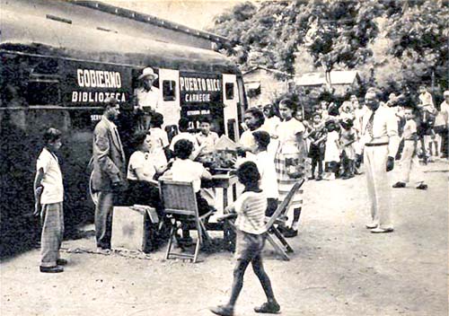 A library on wheels — the Carnegie "Bookmobile"—is bringing daily joy and new knowledge to hundreds of children and adults in small communities throughout Puerto Rico. Launched in 1948, Puerto Rico's traveling library now has two well stocked buses operating out of San Juan serving the north coast; another is soon to service the south coast out of Ponce. Mission of the "Bookmobile", says Federico Porrata Doria, who directs thc operationf is to make available all types of books to the public in outlying communities (barrios) where no nearby library service is available. In education-conscious Puerto Rico (one third of the Island's budget goes into education) the "Bookmobile" customers range from lower grade tots to 80 and 90 year old villagers. Una biblioteca rodante - la Carnegie "Bookmobile" - está trayendo alegría diaria y nuevos conocimientos a cientos de niños y adultos a las pequeñas comunidades en todo Puerto Rico. Lanzada en 1948, la biblioteca itinerante de Puerto Rico tiene ahora dos autobuses bien surtidos operando desde San Juan sirviendo la costa norte; Pronto otro servicio cubrirá la costa sur desde Ponce. La misión del "Bookmobile", dice Federico Porrata Doria, quien dirige la operación, es poner a disposición del público todo tipo de libros en barrios donde no hay servicio de biblioteca cercano. En el Puerto Rico de educación consciente (un tercio del presupuesto de la isla se dedica a la educación) los clientes de "Bookmobile" van desde niños de grados escolares primarios hasta aldeanos de 80 a 90 años. |