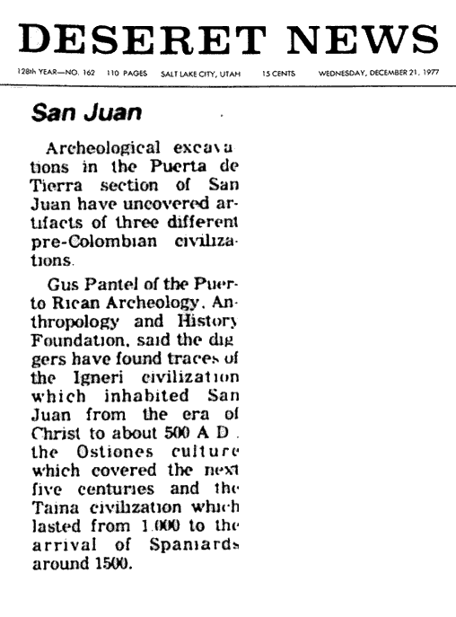 Gus Pantel, de la Fundación Puertorriqueña de Arqueología Antropología e Historia, dijo que los excavadores han encontrado rastros de la civilización Igneri que habitó San Juan desde la era de Cristo hasta aproximadamente el año 500 d.C., la cultura Ostiones que abarcó los cinco siglos siguientes y la civilización Taína que duró desde el año 1.000 hasta la llegada de los españoles alrededor del 1.500. |
