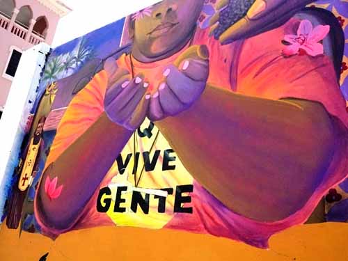 Había llegado el medio día. El muralista David Zayas y varios colaboradores recesaban para almorzar y para apartarse un rato del candente sol. Le habían dedicado la mañana al desarrollo del mural “Aquí vive gente cosechando futuro”, que se despliega en una de las paredes del Colegio San Agustín, ubicado en la avenida Constitución de San Juan, a la altura de la calle Pelayo. Tras varias semanas de trabajo, finalmente el pasado domingo, 9 de junio el grupo terminó el mural.