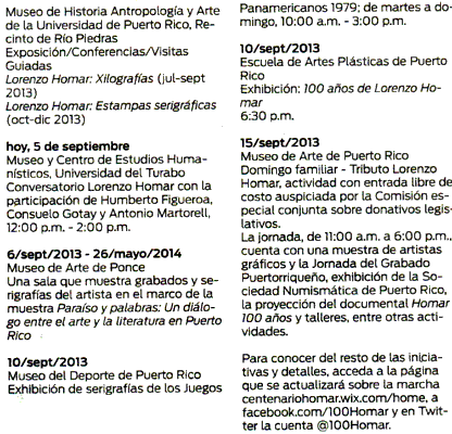 Con motivo de esta efeméride, el Comité organizador para la celebración del centenario de Lorenzo Homar presentó ayer, en una rueda de prensa en el Teatro Raúl Juliá-Banco Popular del Museo de Arte de Puerto Rico (MAPR) en Santurce, la programación que se desarrollará hasta septiembre de 2014 para reconocer el legado de la obra de quien nació un 10 de septiembre. El trabajo toma forma a través de 25 instituciones culturales y deportivas del sector público y privado que integran el comité coordinado por el MAPR y se espera que a esa lista se sumen otras. Según la directora del MAPR, la doctora Lourdes Ramos, ya hay conversaciones para ese fin con El Museo del Barrio y Hunter College.