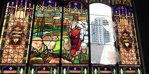 Los vitrales arriba del altar y en los laterales de la iglesia San Agustín no resistieron el fuerte viento del huracán María. La vidriera de colores del Santísimo Redentor y los símbolos de la iglesia ahora rotos, fueron hechos en Alemania a principios de siglo 20 y eran parte del tesoro cultural e histórico de Puerto Rico.