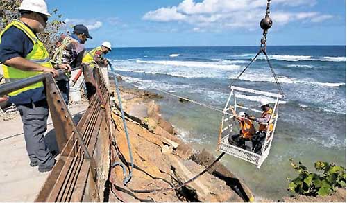 la canasta de una grúa y bajó hasta el área de la playa —30 pies