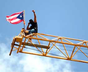 banderas puertorriqueñas, amarraron una carpa en la grúa más baja, elevada