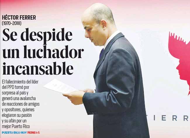 Puerto Rico se estremeció ayer en la tarde con el repentino fallecimiento del dirigente político Héctor Ferrer, exlegislador, presidente del Partido Popular Democrático (PPD) y quien se encaminaba a aspirar a la gobernación en el 2020 hasta que hace apenas un mes y medio un grave padecimiento de salud del que nunca se dieron detalles lo sacó del ojo público abruptamente, para siempre.