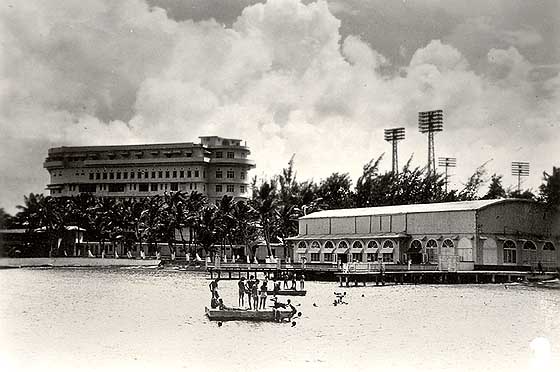 “El salón de las naciones”, una amplia pista con piso de mármol pulido, ligeramente resbaladizo, ideal para bailar, ocupaba casi todo el espacio de la nave principal. Tenía dos tarimas situadas en lados opuestos y una barra cerca de la puerta noroeste que daba al balneario en forma de herradura. Las dos puntas estaban unidas por un puente de madera en cuya base submarina se adaptó un enrejillado de metal para impedir el paso de picúas y tiburones. Se aseguró la quietud de las aguas construyendo un rompeolas de roca y cemento localizado a mar abierto, al otro lado del puente. El área sureste contaba con cabañas para alquilar a los socios pero la atracción sería la pista de baile rodeada de ventanales con cortinas corredizas y puertas de cristal que al abrirse conectaban a terrazas que se adentraban en el mar.