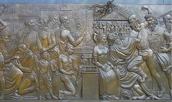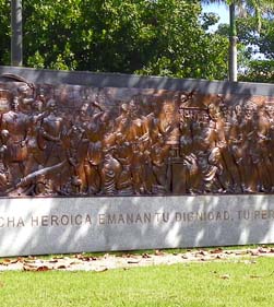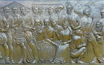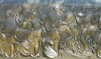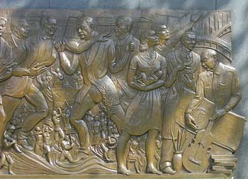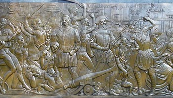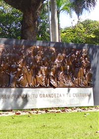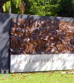 El gran relieve monumental es una sinopsis de los momentos históricos y de las figuras que dieron forma a esa historia y cultura desde la época precolombina hasta el presente.